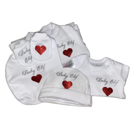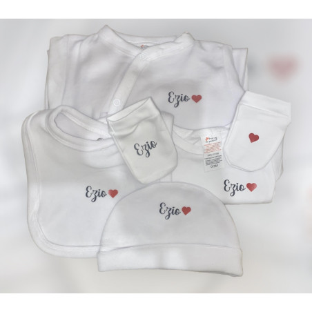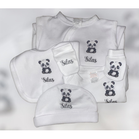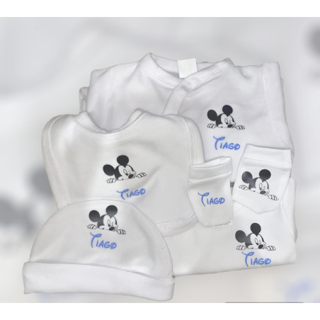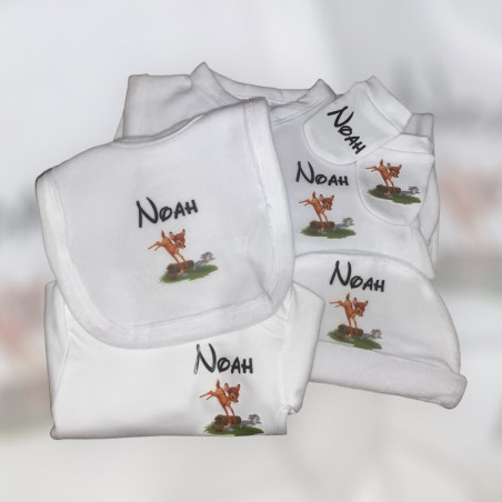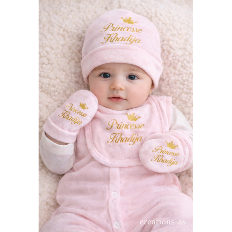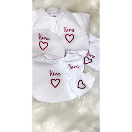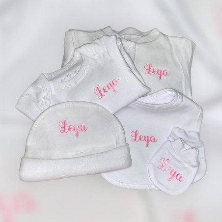 Coffret naissance 5 pièces personnalisé avec prénom : pyjama, body, bonnet, moufles et bavoir. Un cadeau bébé unique, doux et prêt à offrir 💖